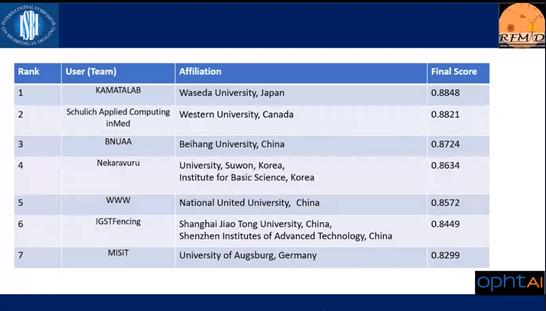 近日,IEEE ISBI 2021 Retinal Image Analysis for multi-Disease Detection(RIADD)竞赛决赛落下帷幕。经过为期两个多月紧张激烈的比拼,世俱杯sjb官网代表队从上海交通大学、国立台湾大学、日本早稻田大学、日本京都大学、加拿大韦仕敦大学等全球70多支参赛队伍中脱颖而出,取得第三名的好成绩,并受邀在ISBI研讨会中对获胜算法的技术细节进行展示。