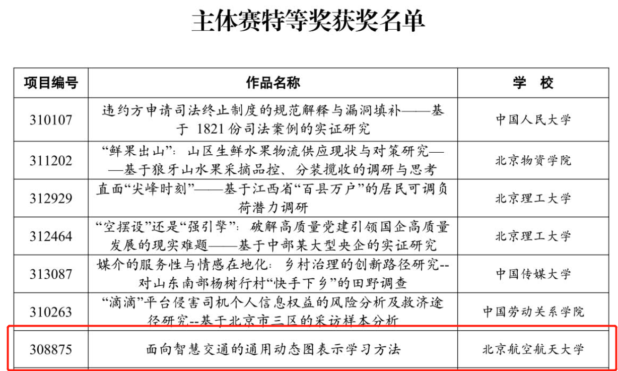 5月30日,由共青团北京市委员会、北京市教育委员会、北京市科学技术协会、北京市学生联合会主办,北京工商大学承办的“青创北京”2023年“挑战杯”首都大学生课外学术科技作品竞赛在北京工商大学良乡主校区落下帷幕。在我院孙磊磊老师的指导下,2019级本科生张瑞星、黄逸菲同学所申报的项目《面向智慧交通的通用动态图表示学习方法》成功斩获主赛道特等奖!